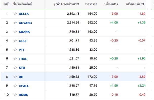 10 อันดับหลักทรัพย์ที่มีมูลค่าการซื้อขายสูงสุด