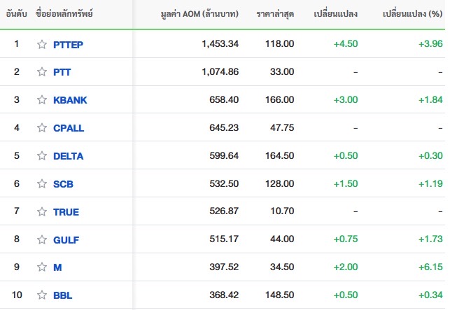 10 อันดับหลักทรัพย์ที่มีมูลค่าการซื้อขายสูงสุด