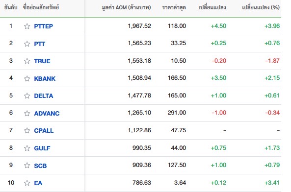 10 อันดับหลักทรัพย์ที่มีมูลค่าการซื้อขายสูงสุด