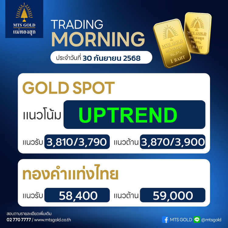 ภาพรวมราคาทองคำยังอยู่ในแนวโน้มทิศทางขาขึ้น โดยวันนี้คาดว่าราคาทองคำจะมีกรอบแนวรับที่ระดับ 3,810 เหรียญ และแนวต้านที่ระดับ 3,870 เหรียญ