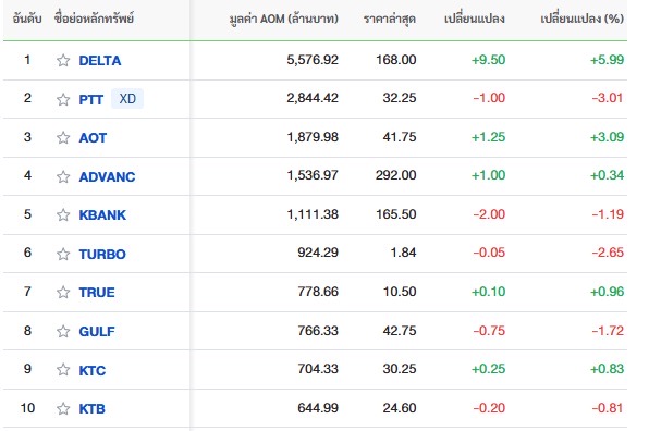 10 อันดับหลักทรัพย์ที่มีมูลค่าการซื้อขายสูงสุด