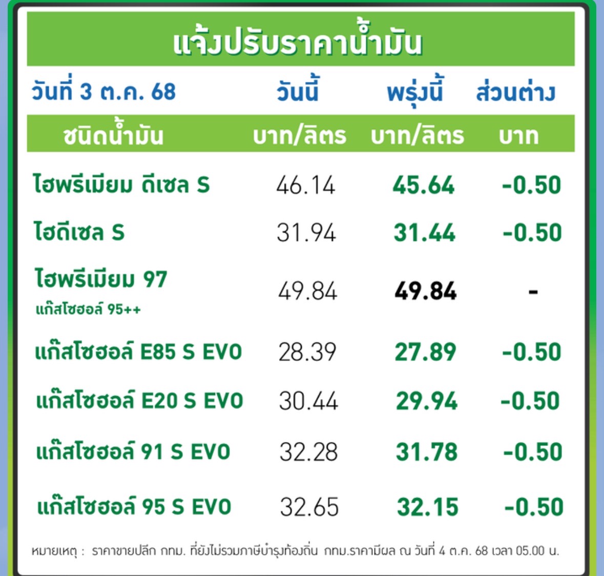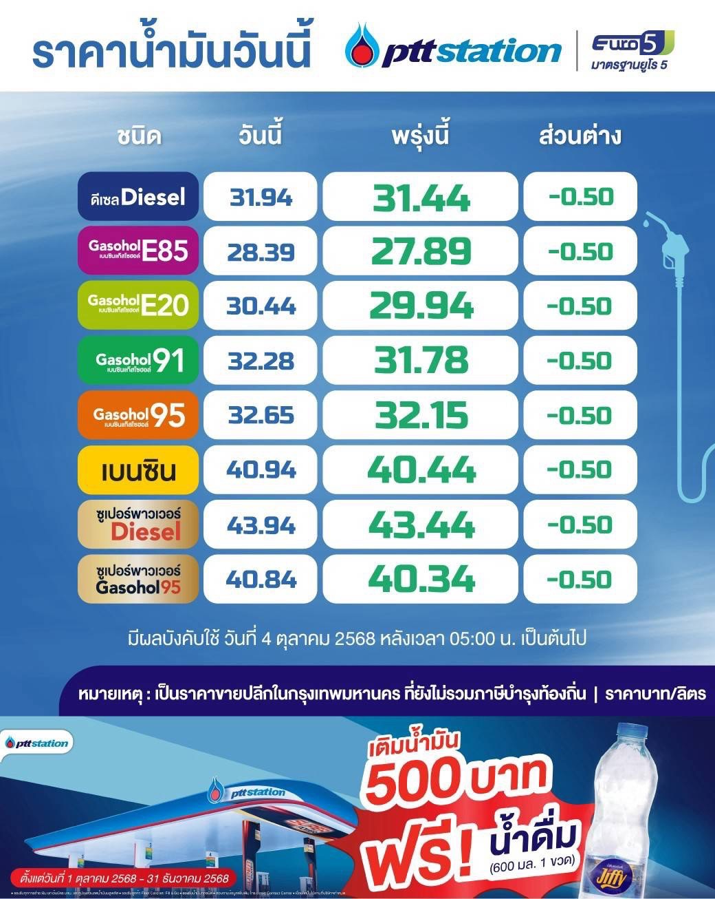 PTT Station ประกาศปรับราคาขายปลีกน้ำมันกลุ่มดีเซลและกลุ่มเบนซิน-แก๊สโซฮอล์ ลดลง 0.50 บาท/ลิตร มีผล 4 ต.ค. 2568 เวลา 05.00 น.เป็นต้นไป