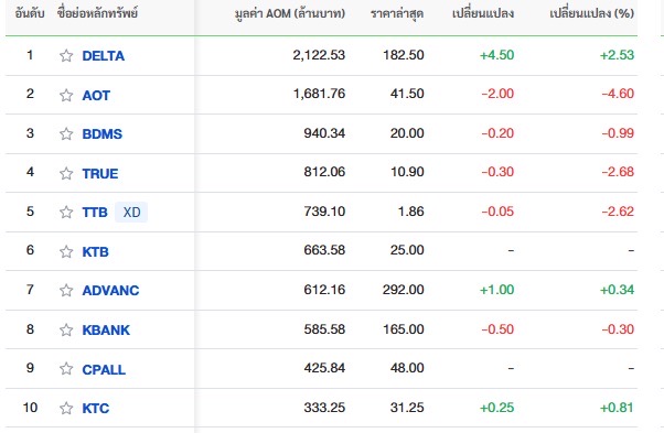 10 อันดับหลักทรัพย์ที่มีมูลค่าการซื้อขายสูงสุด