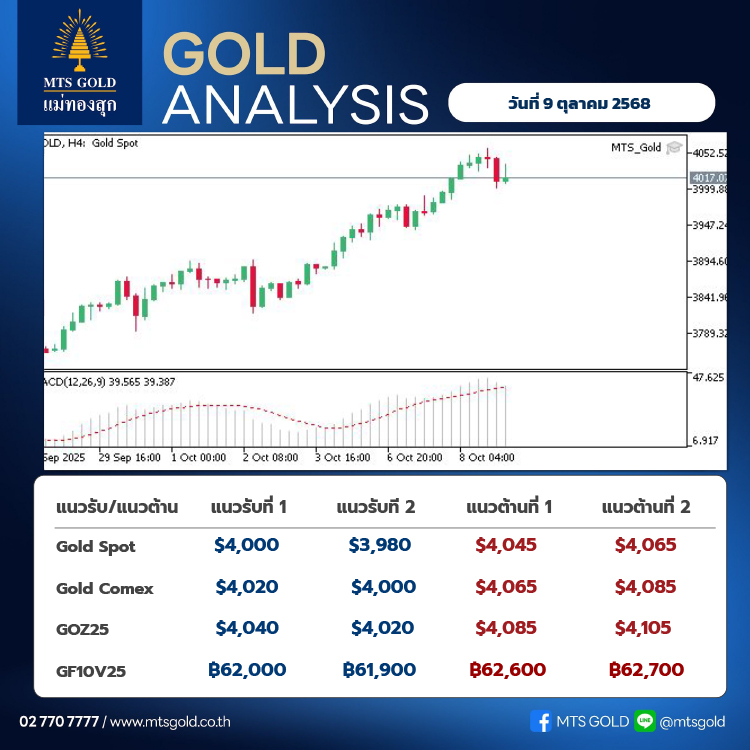 ในทางเทคนิคราคาทองคำยังไม่มีสัญญาณการกลับตัวที่ชัดเจน และภาพรวมราคายังปรับตัวสูงขึ้นอย่างต่อเนื่อง โดยวันนี้คาดว่าราคาทองคำจะมีกรอบแนวรับที่ระดับ 4,000 เหรียญ และแนวต้านที่ระดับ 4,045 เหรียญ