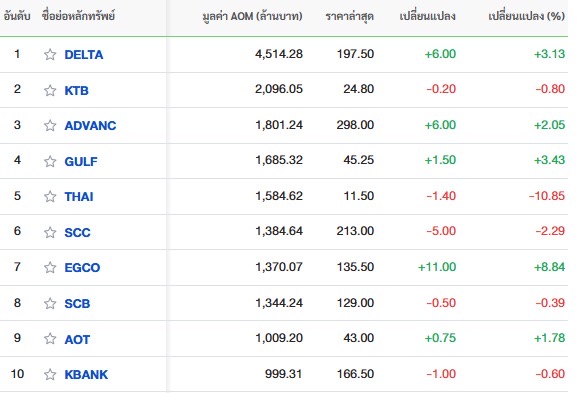 10 อันดับหลักทรัพย์ที่มีมูลค่าการซื้อขายสูงสุด