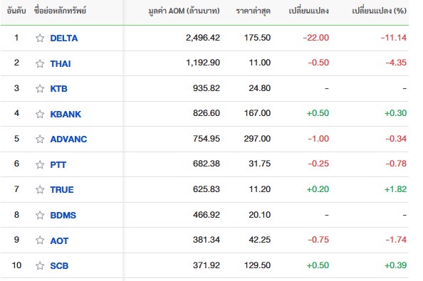 10 อันดับหลักทรัพย์ที่มีมูลค่าการซื้อขายสูงสุด