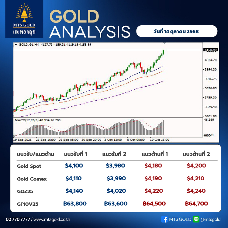 สำหรับ Gold Online Futures คาดจะมีกรอบแนวรับ 4,140 เหรียญ และแนวต้าน 4,220 เหรียญ และ Gold Comex คาดจะมีกรอบแนวรับ 4,110 เหรียญ และแนวต้าน 4,190 เหรียญ ในส่วนของราคาทองไทยจะมีแนวรับระยะสั้นที่ 63,500 บาท/บาททองคำ และมีแนวต้านระยะสั้นที่ 64,500 บาท/บาททองคำ