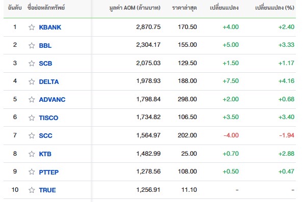 10 อันดับหลักทรัพย์ที่มีมูลค่าการซื้อขายสูงสุด