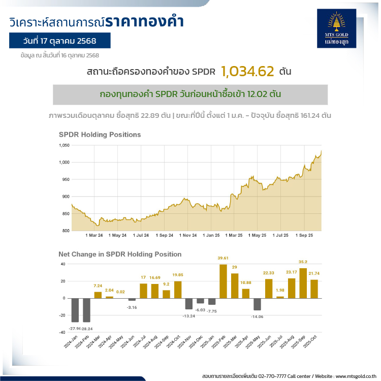ราคาทองคำยังคงทำสถิติสูงสุดใหม่ (All-Time High) ที่ระดับ 4,230 เหรียญ ได้อย่างต่อเนื่อง แรงหนุนหลักมาจากความกังวลต่อสถานการณ์สงครามการค้าระหว่างสหรัฐฯ และจีน ภายหลังประธานาธิบดีทรัมป์ยืนยันการเริ่มสงครามการค้าและยังคงมีท่าทีขู่ขึ้นภาษีนำเข้าจากจีนถึง 100% นอกจากนี้ ภาวะการว่างงานที่เพิ่มขึ้นอย่างต่อเนื่องในสหรัฐฯ ได้สร้างแรงกดดันให้ธนาคารกลางสหรัฐฯ (Fed) พิจารณาการปรับลดอัตราดอกเบี้ยลงอีก 0.25% ในช่วงปลายเดือนตุลาคมนี้ ในส่วนดัชนีดอลลาร์สหรัฐฯ ปรับตัวอ่อนค่าลงอย่างชัดเจน จากระดับ 99.05 จุด มาอยู่ที่ 98.50 จุด ขณะที่ค่าเงินบาทไทยแข็งค่าขึ้นเล็กน้อยในช่วงเช้าวันนี้ โดยเคลื่อนไหวจาก 32.74 บาทต่อดอลลาร์ มาที่ 32.45 บาทต่อดอลลาร์ ด้านความเคลื่อนไหวของกองทุนทองคำรายใหญ่ SPDR Gold Shares รายงานการเข้าซื้อสุทธิในวันทำการก่อนหน้าจำนวน 1.15 ตัน ส่งผลให้ปัจจุบันถือครองทองคำรวมที่ 1,022.6 ตัน ภาพรวมการซื้อขายของกองทุน SPDR ในเดือนตุลาคมนี้ เป็นการซื้อสุทธิรวม 10.87 ตัน และนับตั้งแต่ต้นปี (1 ม.ค. - ปัจจุบัน) มีการซื้อสุทธิสะสมรวม 149.22 ตัน