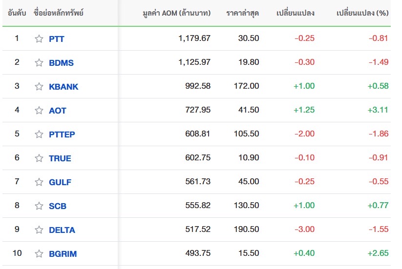 10 อันดับหลักทรัพย์ที่มีมูลค่าการซื้อขายสูงสุด