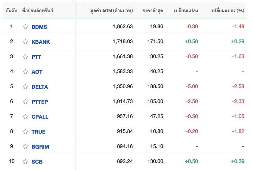 10 อันดับหลักทรัพย์ที่มีมูลค่าการซื้อขายสูงสุด