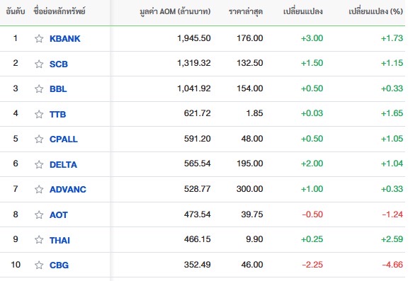 10 อันดับหลักทรัพย์ที่มีมูลค่าการซื้อขายสูงสุด