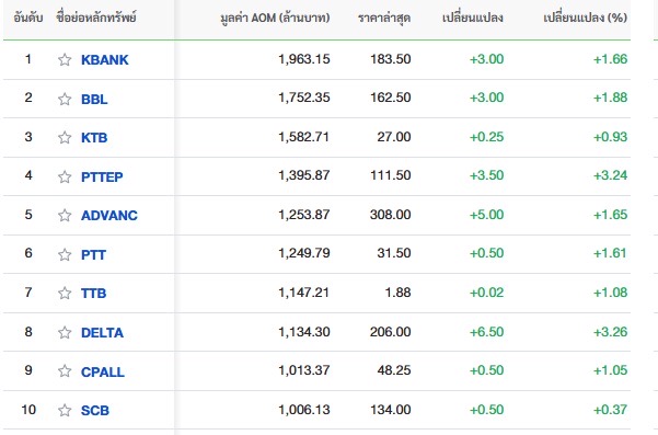 10 อันดับหลักทรัพย์ที่มีมูลค่าการซื้อขายสูงสุด