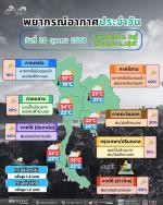 กรมอุตุนิยมวิทยา พยากรณ์อากาศ 24 ชั่วโมงข้างหน้า วันที่ 29 ตุลาคม 2568 ประเทศไทยตอนบนมีฝนเพิ่มขึ้น และมีฝนตกหนักบางแห่งในภาคตะวันออกเฉียงเหนือตอนล่าง แต่ยังคงมีอากาศเย็นในตอนเช้าบริเวณภาคเหนือ และภาคตะวันออกเฉียงเหนือ เนื่องจากมีหย่อมความกดอากาศต่ำกำลังแรงปกคลุมบริเวณชายฝั่งประเทศเวียดนามตอนล่าง ส่งผลทำให้มีลมฝ่ายตะวันออกพัดนำความชื้นเข้ามาปกคลุมประเทศไทยตอนบน ในขณะที่บริเวณความกดอากาศสูงหรือมวลอากาศเย็นที่ปกคลุมประเทศไทยตอนบนเริ่มมีกำลังอ่อนลง ขอให้ประชาชนบริเวณประเทศไทยตอนบนดูแลรักษาสุขภาพเนื่องจากสภาพอากาศที่เปลี่ยนแปลงในระยะนี้ไว้ด้วย