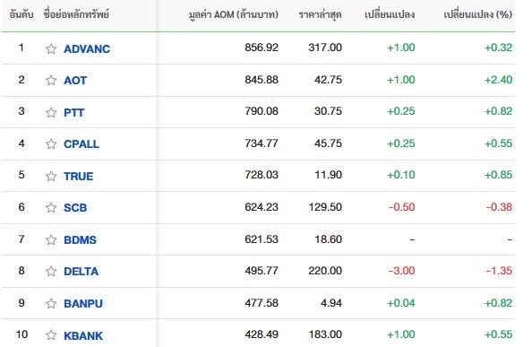 10 อันดับหลักทรัพย์ที่มีมูลค่าการซื้อขายสูงสุด