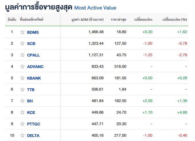 10 อันดับหลักทรัพย์ที่มีมูลค่าการซื้อขายสูงสุด