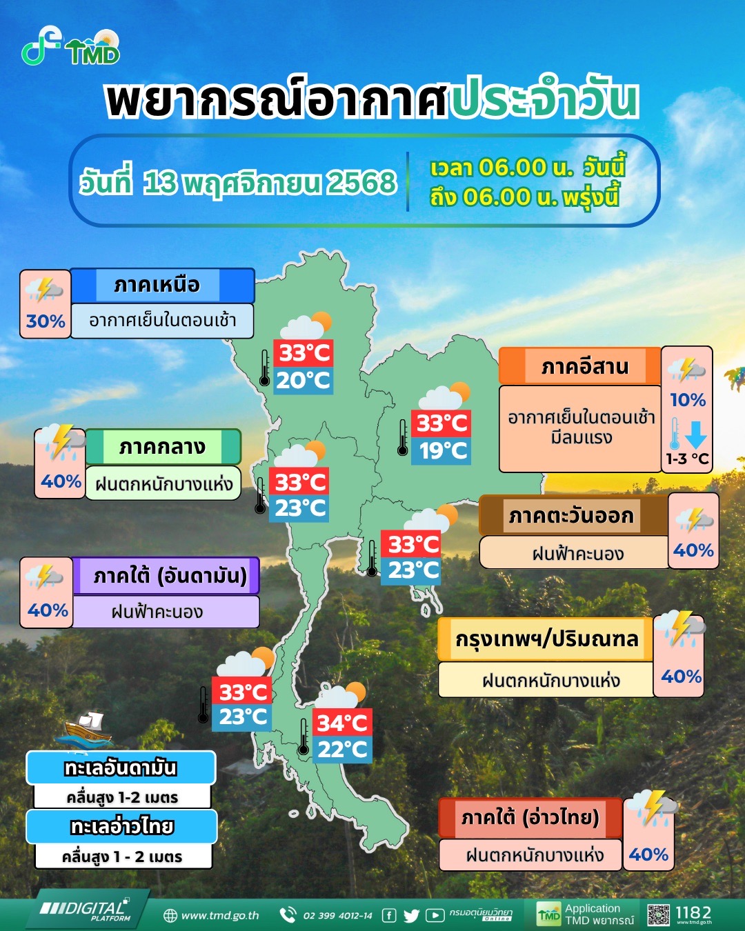 กรมอุตุนิยมวิทยา พยากรณ์อากาศ 24 ชั่วโมงข้างหน้า วันที่ 13 พฤศจิกายน 2568 ประเทศไทยยังคงมีฝนฟ้าคะนอง และมีฝนตกหนักบางแห่งในภาคกลางตอนล่าง รวมทั้งกรุงเทพมหานครและปริมณฑล ภาคตะวันออก และภาคใต้ตอนบน ในขณะที่ภาคตะวันออกเฉียงเหนือจะมีอุณหภูมิลดลง 1-3 องศาเซลเซียส กับมีลมแรง เนื่องจากบริเวณความกดอากาศสูงหรือมวลอากาศเย็นกำลังค่อนข้างแรงจากประเทศจีนได้แผ่ลงมาปกคลุมภาคตะวันออกเฉียงเหนือตอนบนแล้ว คาดว่าจะแผ่ลงมาปกคลุมภาคตะวันออกเฉียงเหนือตอนล่าง และทะเลจีนใต้ในวันนี้ (13 พ.ย. 68) ส่งผลให้มีลมตะวันออกและลมตะวันออกเฉียงใต้พัดนำความชื้นเข้ามาปกคลุมภาคตะวันออก ภาคกลาง รวมทั้งกรุงเทพมหานครและปริมณฑล ภาคใต้ตอนบน และภาคเหนือตอนล่าง ขอให้ประชาชนในบริเวณดังกล่าวดูแลรักษาสุขภาพเนื่องจากสภาพอากาศที่เปลี่ยนแปลงไว้ด้วย
