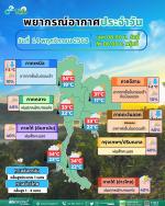 กรมอุตุนิยมวิทยา พยากรณ์อากาศ 24 ชั่วโมงข้างหน้า วันที่ 14 พฤศจิกายน 2568 ภาคตะวันออกเฉียงเหนือ ภาคเหนือ และภาคตะวันออกทางตอนบนของภาคมีอากาศเย็นในตอนเช้า โดยจะมีอุณหภูมิลดลงอีก 1-2 องศาเซลเซียส ส่วนภาคกลางด้านตะวันออกและภาคตะวันออกตอนบนจะมีอุณหภูมิลดลงเล็กน้อย เนื่องจากบริเวณความกดอากาศสูงหรือมวลอากาศเย็นกำลังปานกลางจากประเทศจีนได้แผ่ลงมาปกคลุมบริเวณดังกล่าว ส่วนภาคกลาง ภาคตะวันออก รวมทั้งกรุงเทพมหานครและปริมณฑล และภาคเหนือ มีฝนลดลงแต่ยังคงมีฝนฟ้าคะนองเกิดขึ้นได้บางพื้นที่ โดยมีฝนตกหนักบางแห่งบริเวณภาคกลางด้านตะวันตก เนื่องจากมีลมตะวันออกและลมตะวันออกเฉียงใต้พัดนำความชื้นเข้ามาปกคลุมบริเวณดังกล่าว ขอให้ประชาชนในบริเวณประเทศไทยตอนบนดูแลรักษาสุขภาพเนื่องจากสภาพอากาศที่เปลี่ยนแปลงไว้ด้วย