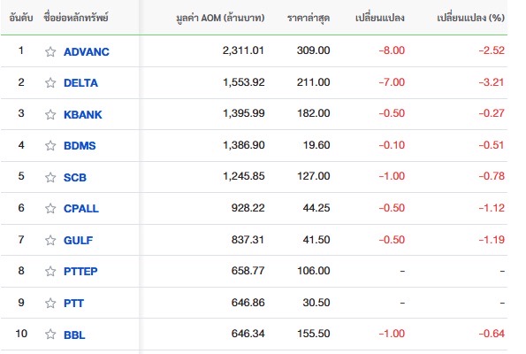 10 อันดับหลักทรัพย์ที่มีมูลค่าการซื้อขายสูงสุด