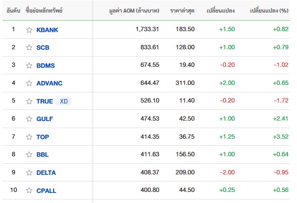 10 อันดับหลักทรัพย์ที่มีมูลค่าการซื้อขายสูงสุด