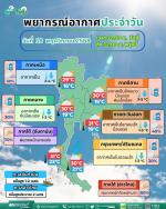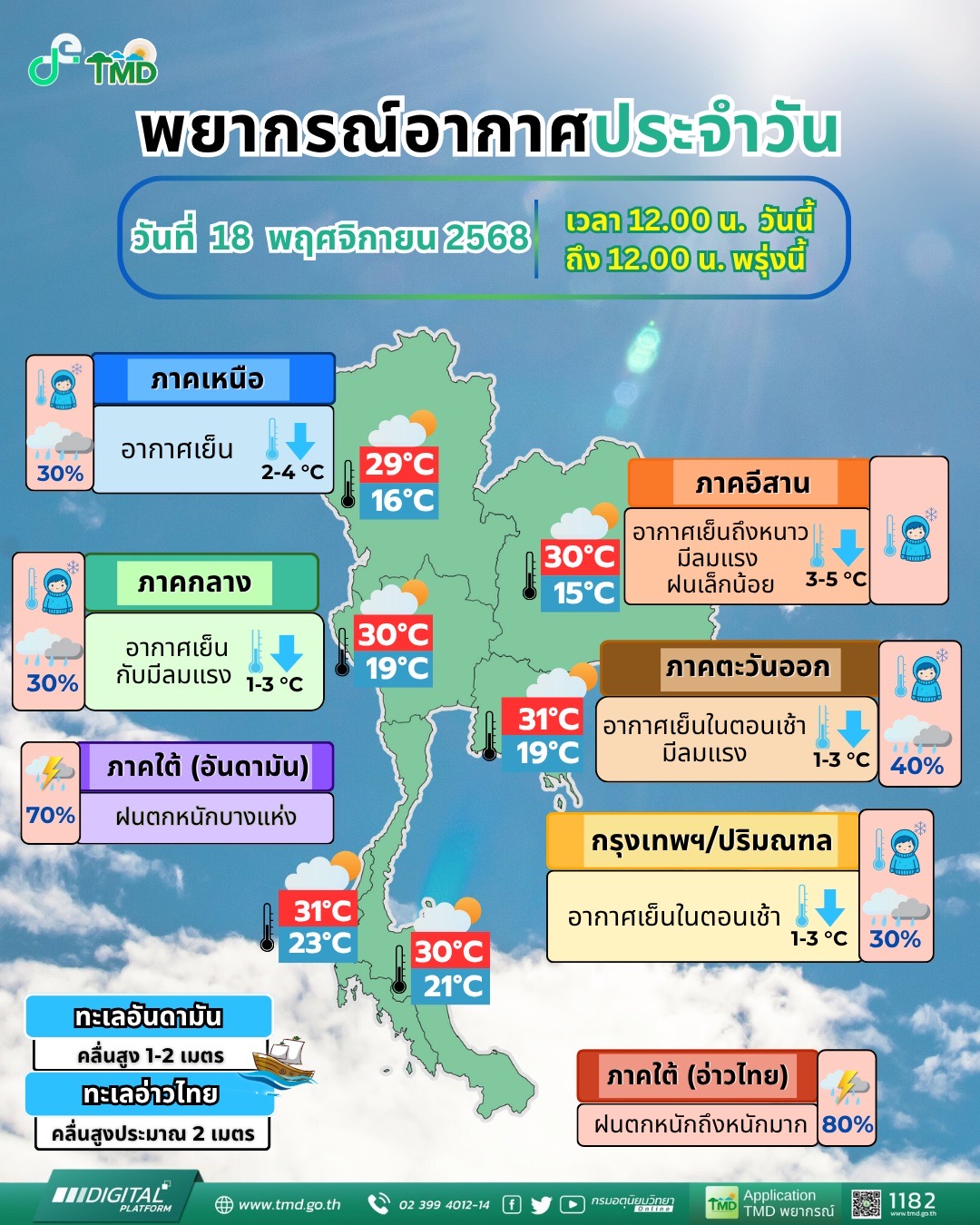 กรมอุตุนิยมวิทยา พยากรณ์อากาศ 24 ชั่วโมงข้างหน้า วันที่ 18 พฤศจิกายน 2568 ประเทศไทยตอนบนอุณหภูมิจะลดลงกับมีลมแรง แต่ยังคงมีฝนบางพื้นที่ โดยภาคตะวันออกเฉียงเหนือ อุณหภูมิจะลดลง 3-5 องศาเซลเซียส ภาคเหนือ อุณหภูมิจะลดลง 2-4 องศาเซลเซียส ส่วนภาคกลาง รวมทั้งกรุงเทพมหานครและปริมณฑล และภาคตะวันออก อุณหภูมิจะลดลง 1-3 องศาเซลเซียส ขอให้ประชาชนในบริเวณดังกล่าวดูแลรักษาสุขภาพเนื่องจากสภาพอากาศที่เปลี่ยนแปลง ส่วนเกษตรกรควรป้องกันและระวังความเสียหายที่จะเกิดต่อผลผลิตทางการเกษตรไว้ด้วย ทั้งนี้เนื่องจากบริเวณความกดอากาศสูงหรือมวลอากาศเย็นกำลังแรงจากประเทศจีนได้แผ่ปกคลุมภาคตะวันออกเฉียงเหนือแล้ว และจะแผ่ปกคลุมประเทศไทยตอนบนภายในวันนี้