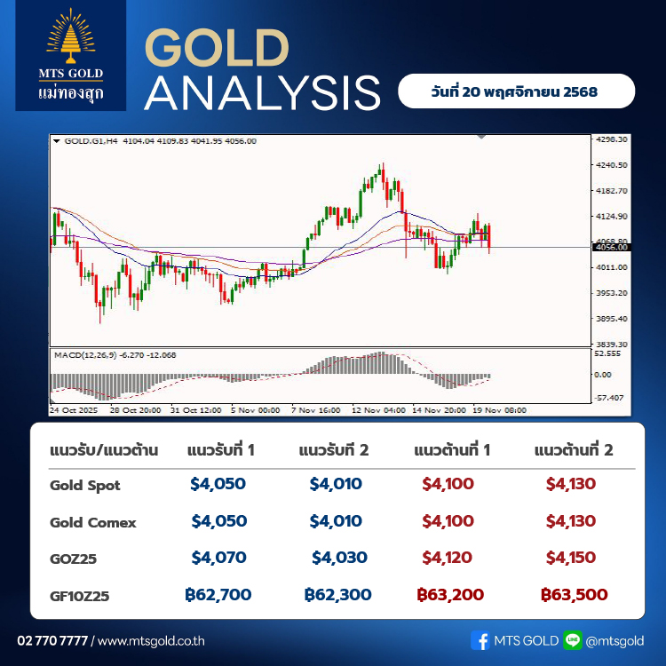 สำหรับ Gold Online Futures คาดจะมีกรอบแนวรับ 4,070 เหรียญ และแนวต้าน 4,120 เหรียญ และ Gold Comex คาดจะมีกรอบแนวรับ 4,050 เหรียญ และแนวต้าน 4,100เหรียญ Gold Futures Series V25 จะมีแนวรับที่ระดับ 62,700 บาท และแนวต้านที่ระดับ 63,200 บาท