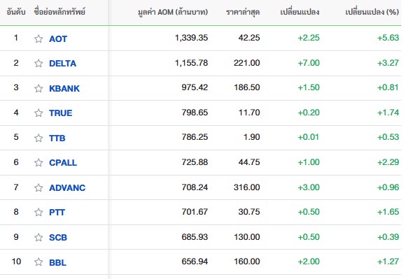 10 อันดับหลักทรัพย์ที่มีมูลค่าการซื้อขายสูงสุด