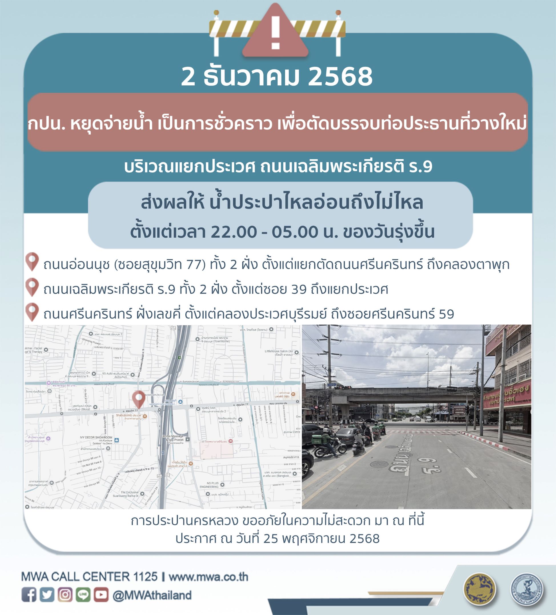 การประปานครหลวง (กปน.) ขอแจ้งให้ทราบว่า จะดำเนินการตัดบรรจบท่อประธานเดิมเข้ากับท่อประธานที่วางใหม่ ในพื้นที่บริเวณแยกประเวศ ถนนเฉลิมพระเกียรติ ร.9 เพื่อให้ประชาชนได้รับบริการน้ำประปาอย่างเพียงพอและทั่วถึง จึงมีความจำเป็นต้องหยุดจ่ายน้ำ เป็นการชั่วคราว ในคืนวันอังคารที่ 2 ธันวาคม 2568 ตั้งแต่เวลา 22.00 - 05.00 น. ของวันรุ่งขึ้น โดยระหว่างดำเนินการ ส่งผลให้ น้ำประปาไหลอ่อนถึงไม่ไหล ในพื้นที่ดังต่อไปนี้