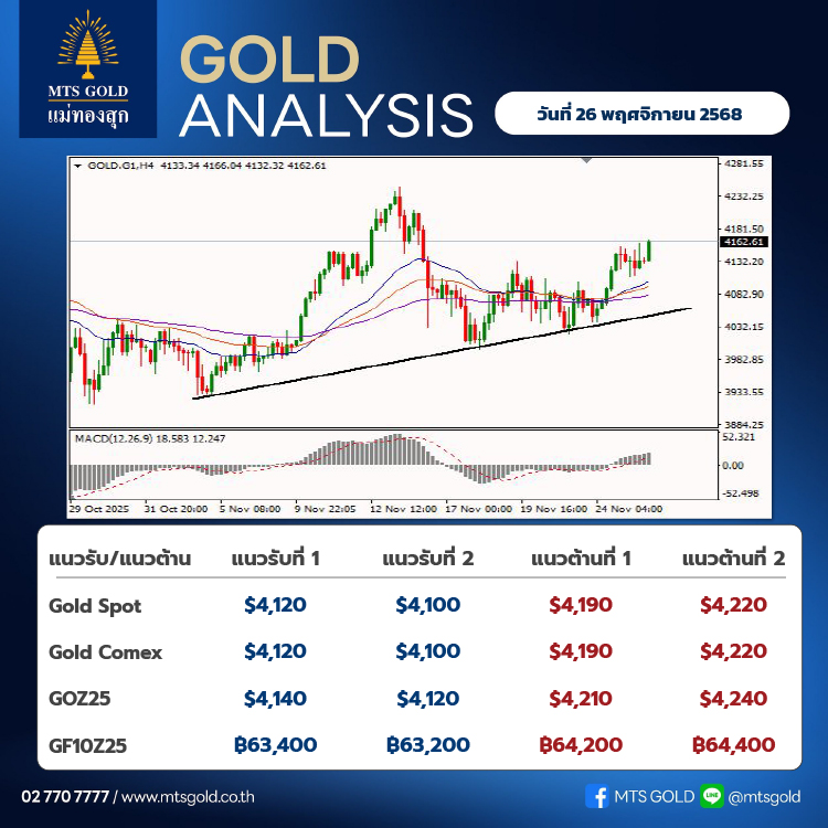 สำหรับ Gold Online Futures คาดจะมีกรอบแนวรับ 4,120 เหรียญ และแนวต้าน 4,210 เหรียญ และ Gold Comex คาดจะมีกรอบแนวรับ 4,100 เหรียญ และแนวต้าน 4,190เหรียญ Gold Futures Series V25 จะมีแนวรับที่ระดับ 63,200 บาท และแนวต้านที่ระดับ 64,200 บาท