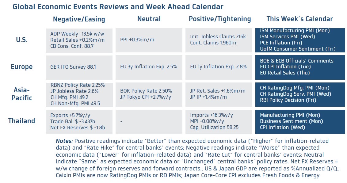 สำหรับในสัปดาห์นี้ เรามองว่า ควรรอติดตาม รายงานข้อมูลเศรษฐกิจสำคัญสหรัฐฯ โดยเฉพาะข้อมูลตลาดแรงงานสหรัฐฯ จากภาคเอกชน อย่าง ADP, Revelio และ Challenger พร้อมทั้งจับตาพัฒนาการของการเจรจาเพื่อยุติสงครามรัสเซีย-ยูเครน