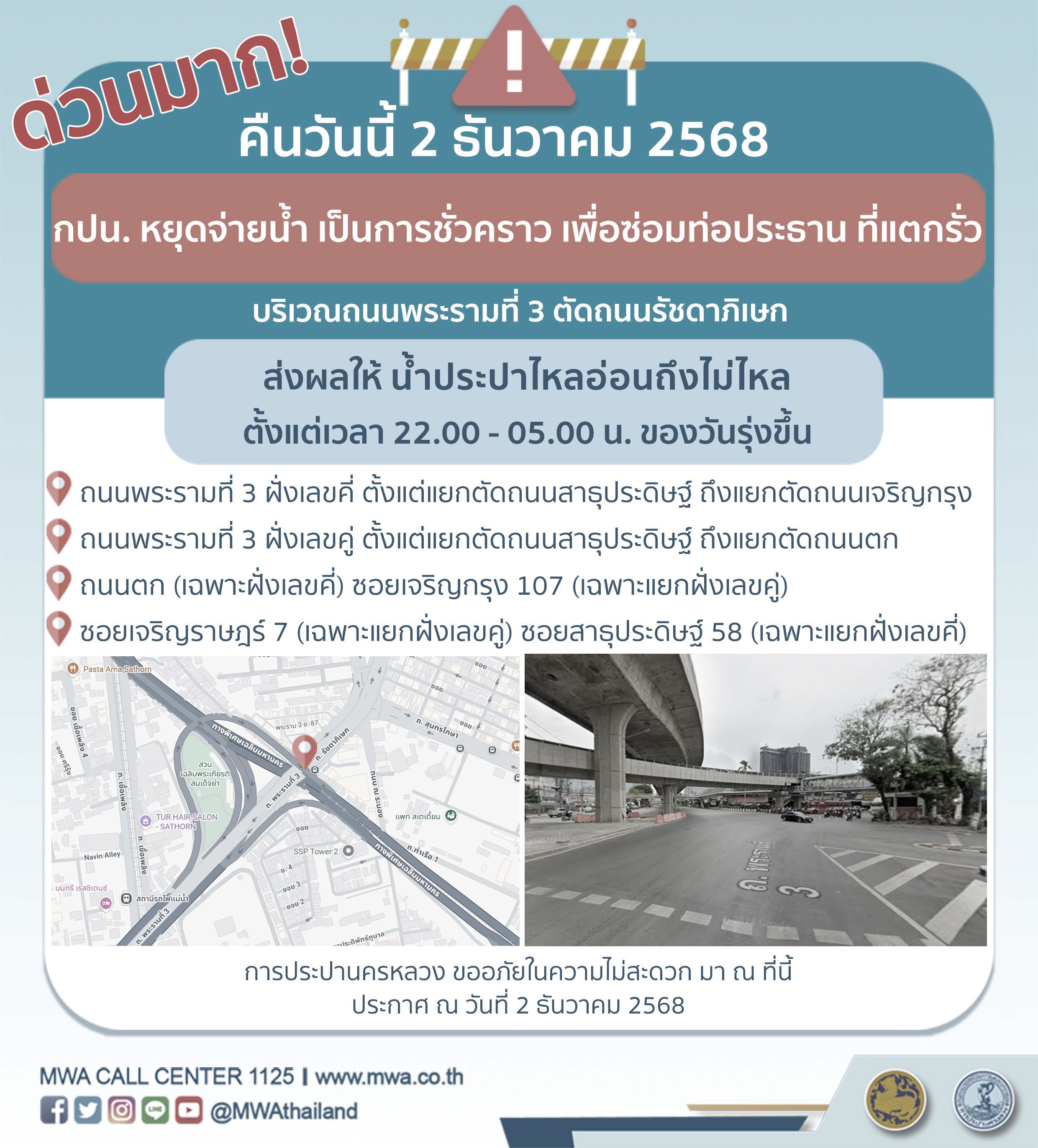 การประปานครหลวง (กปน.) ขอแจ้งให้ทราบว่า จะดำเนินการซ่อมท่อประธาน ที่แตกรั่ว ในพื้นที่บริเวณถนนพระรามที่ 3 ตัดถนนรัชดาภิเษก เพื่อให้ประชาชนได้รับบริการน้ำประปาอย่างเพียงพอและทั่วถึง จึงมีความจำเป็นต้องหยุดจ่ายน้ำ เป็นการชั่วคราว ในคืนวันนี้ (วันอังคารที่ 2 ธันวาคม 2568) ตั้งแต่เวลา 22.00 - 05.00 น. ของวันรุ่งขึ้น โดยระหว่างดำเนินการ ส่งผลให้ น้ำประปาไหลอ่อนถึงไม่ไหล ในพื้นที่ดังต่อไปนี้
