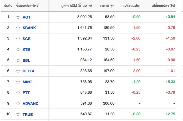 10 อันดับหลักทรัพย์ที่มีมูลค่าการซื้อขายสูงสุด