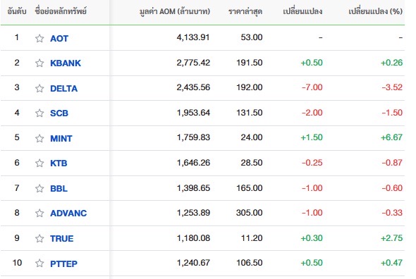 10 อันดับหลักทรัพย์ที่มีมูลค่าการซื้อขายสูงสุด