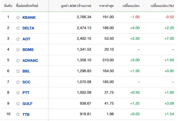 10 อันดับหลักทรัพย์ที่มีมูลค่าการซื้อขายสูงสุด