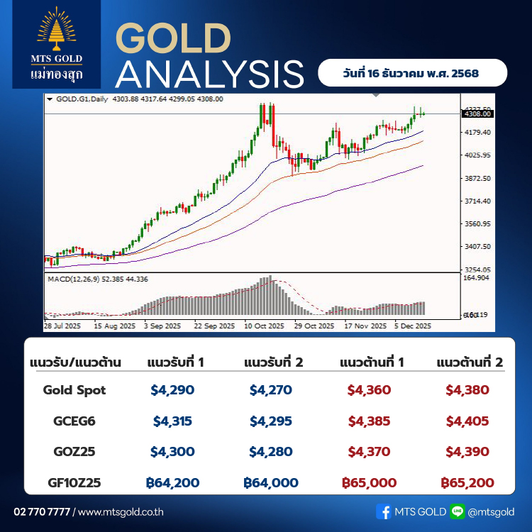 สำหรับ Gold Online Futures คาดจะมีกรอบแนวรับ 4,300 เหรียญ และแนวต้าน 4,370 เหรียญ และ Gold Comex คาดจะมีกรอบแนวรับ 4,315 เหรียญ และแนวต้าน 4,385เหรียญ Gold Futures Series V25 จะมีแนวรับที่ระดับ 64,200 บาท และแนวต้านที่ระดับ 65,000 บาท