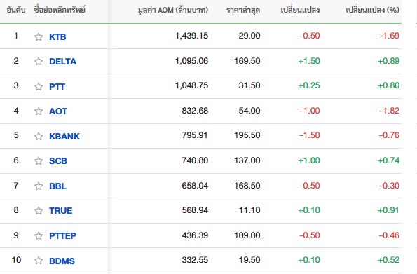 10 อันดับหลักทรัพย์ที่มีมูลค่าการซื้อขายสูงสุด