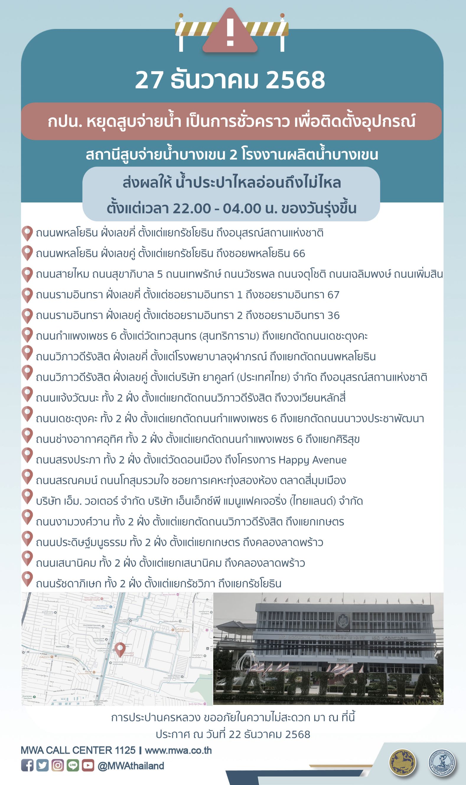 การประปานครหลวง (กปน.) ขอแจ้งให้ทราบว่า จะดำเนินการติดตั้งอุปกรณ์ ในพื้นที่บริเวณโรงงานผลิตน้ำบางเขน เพื่อให้ประชาชนได้รับบริการน้ำประปาอย่างเพียงพอและทั่วถึง จึงมีความจำเป็นต้องหยุดสูบจ่ายน้ำ สถานีสูบจ่ายน้ำบางเขน 2 เป็นการชั่วคราว ในคืนวันเสาร์ที่ 27 ธันวาคม 2568 ตั้งแต่เวลา 22.00 - 04.00 น. ของวันรุ่งขึ้น โดยระหว่างดำเนินการ ส่งผลให้ น้ำประปาไหลอ่อนถึงไม่ไหล ในพื้นที่ดังต่อไปนี้