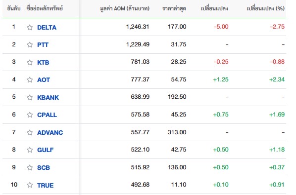 10 อันดับหลักทรัพย์ที่มีมูลค่าการซื้อขายสูงสุด