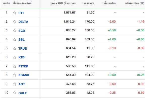 10 อันดับหลักทรัพย์ที่มีมูลค่าการซื้อขายสูงสุด