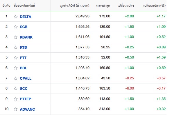 10 อันดับหลักทรัพย์ที่มีมูลค่าการซื้อขายสูงสุด