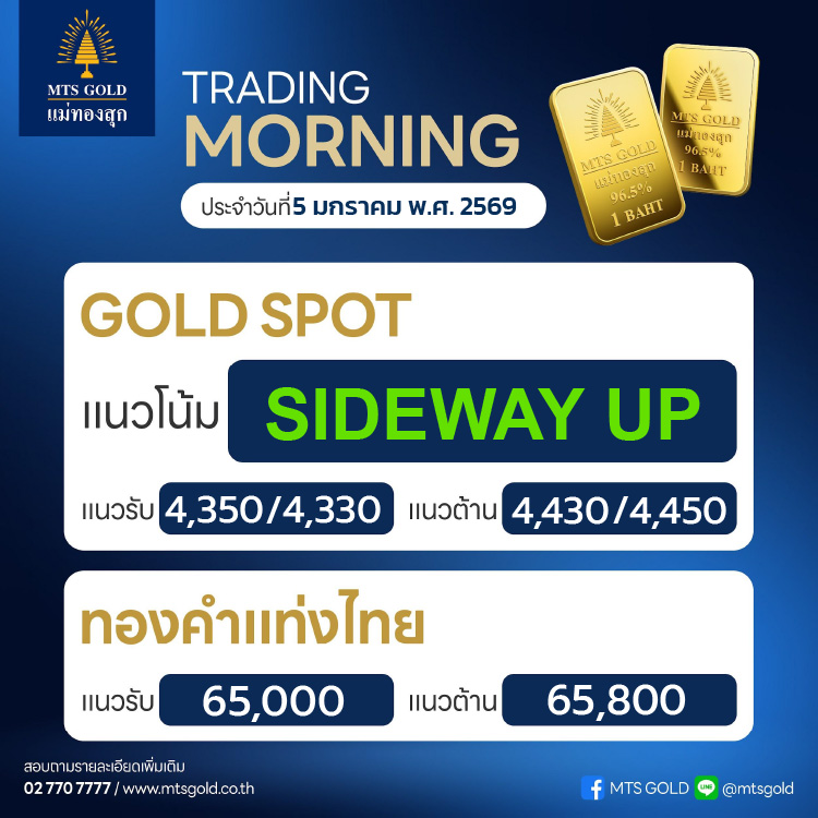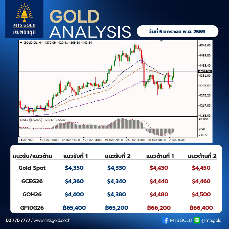 ในเชิงเทคนิค ราคาทองคำยังคงแกว่งตัวในภาวะผันผวน แต่โครงสร้างแนวโน้มหลักยังคงเป็นขาขึ้น โดยประเมินว่าตลอดปีนี้ราคาทองคำยังมีโอกาสปรับตัวสูงขึ้นต่อ จากแรงสนับสนุนของปัจจัยพื้นฐานที่แข็งแกร่ง ขณะที่มุมมองทางเทคนิคคาดว่าการเคลื่อนไหวระยะสั้นจะอยู่ในกรอบผันผวนในกรอบ 100 เหรียญ จึงยังคงแนะนำกลยุทธ์ทยอยสะสมเมื่อราคาอ่อนตัว เพื่อบริหารต้นทุนและความเสี่ยงอย่างเหมาะสม ประเมินกรอบระยะสั้น แนวรับที่ 4,350-4,330 เหรียญ และแนวต้านที่ 4,430-4,450 เหรียญ ขณะที่ทองไทยจะมีแนวรับที่ 65,000 บาท และแนวต้านที่ 65,800 บาท