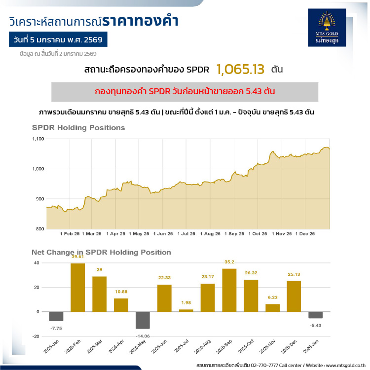ราคาทองคำในวันศุกร์ที่ 2 ม.ค. 2569 ซึ่งเป็นวันทำการแรกของปี เผชิญแรงเทขายค่อนข้างหนาแน่น โดยเฉพาะจากกองทุน SPDR Gold Trust ที่ขายทองคำออกมากกว่า 5.43 ตัน ส่งผลให้ราคาทองคำอ่อนตัวลงในช่วงปลายตลาดและปิดที่บริเวณ 4,330 เหรียญ ท่ามกลางความไม่แน่นอนด้านภูมิรัฐศาสตร์ที่ยังคงกดดันบรรยากาศการลงทุน อย่างไรก็ดี ภาพรวมตลาดทองคำในปี 2025 ยังคงโดดเด่น โดยราคาทองคำปิดสิ้นปีบริเวณ 4,313 เหรียญ ปรับตัวเพิ่มขึ้นตลอดทั้งปีราว 65% ขณะที่ราคาเงิน (Silver) ปิดที่ระดับประมาณ 71.6 เหรียญ เพิ่มขึ้นกว่า 148% สะท้อนแรงหนุนจากความต้องการสินทรัพย์ปลอดภัยและกระแสการกระจายความเสี่ยงออกจากเงินดอลลาร์สหรัฐ