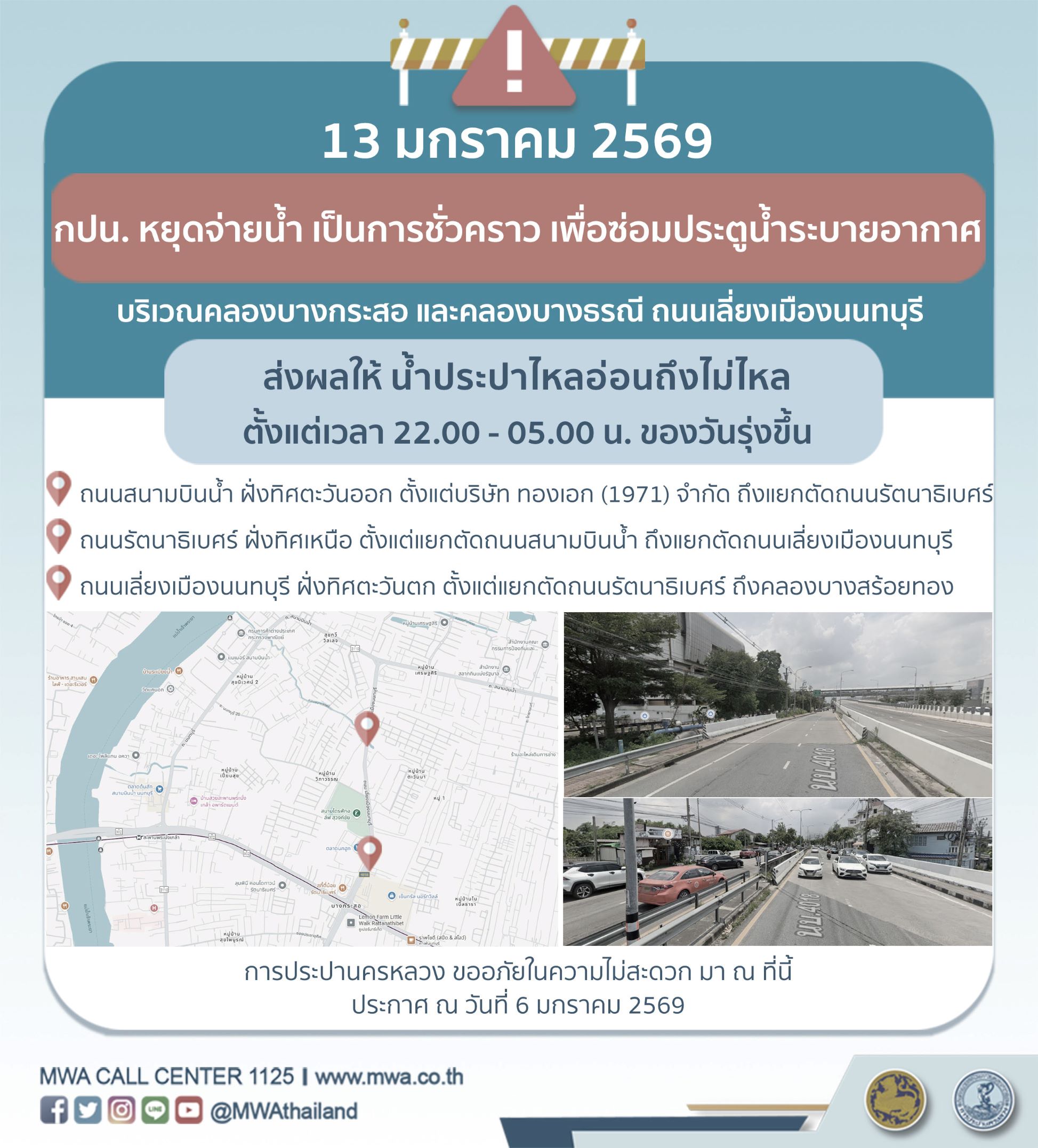 การประปานครหลวง (กปน.) ขอแจ้งให้ทราบว่า จะดำเนินการซ่อมประตูน้ำระบายอากาศ ในพื้นที่บริเวณคลองบางกระสอ และคลองบางธรณี ถนนเลี่ยงเมืองนนทบุรี เพื่อให้ประชาชนได้รับบริการน้ำประปาอย่างเพียงพอและทั่วถึง จึงมีความจำเป็นต้องหยุดจ่ายน้ำ เป็นการชั่วคราว ในคืนวันอังคารที่ 13 มกราคม 2569 ตั้งแต่เวลา 22.00 - 05.00 น. ของวันรุ่งขึ้น โดยระหว่างดำเนินการ ส่งผลให้ น้ำประปาไหลอ่อนถึงไม่ไหล ในพื้นที่ดังต่อไปนี้