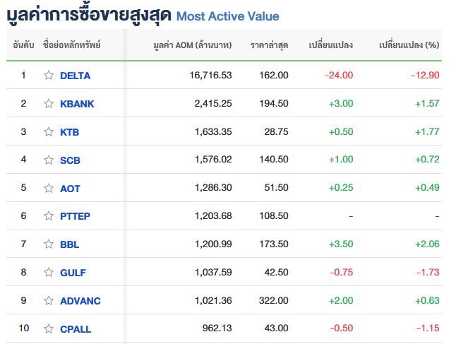 10 อันดับหลักทรัพย์ที่มีมูลค่าการซื้อขายสูงสุด