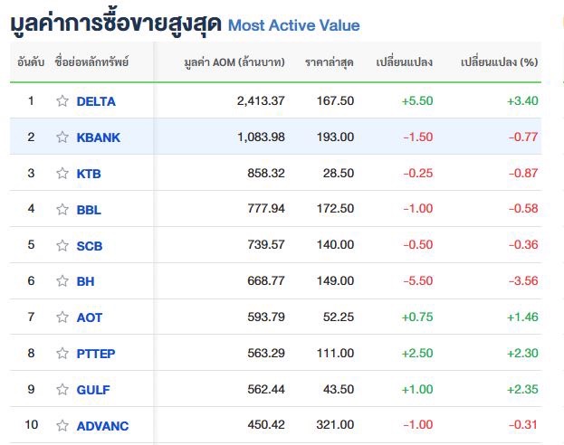 10 อันดับหลักทรัพย์ทรัพย์ที่มีมูลค่าการซื้อขายสูงสุด