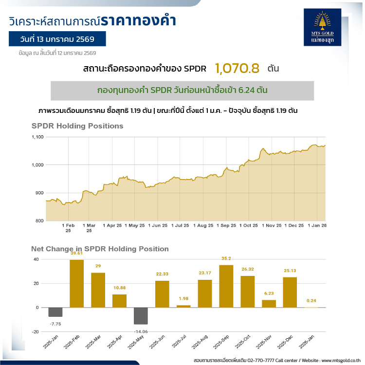 สำหรับปัจจัยที่ต้องติดตามในคืนนี้ นักลงทุนจับตาการประกาศดัชนี CPI สหรัฐฯ เดือนธันวาคม ซึ่งอาจส่งผลต่อการประเมินทิศทางอัตราดอกเบี้ยของเฟดในระยะถัดไป ขณะที่กองทุนทองคำ SPDR วันก่อนหน้าซื้อเข้า 6.24 ตัน ปัจจุบันถือครองที่ 1,070.8 ตันภาพรวมเดือนมกราคม ขายสุทธิ 1.19 ตัน ขณะที่ปีนี้ ตั้งแต่ 1 ม.ค. - ปัจจุบัน ขายสุทธิ 1.19 ตัน