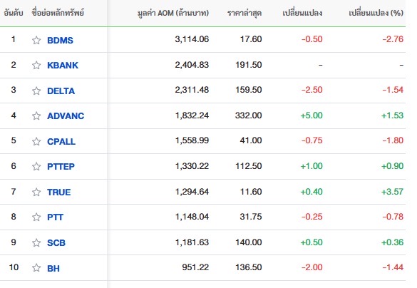 10 อันดับหลักทรัพย์ที่มีมูลค่าการซื้อขายสูงสุด