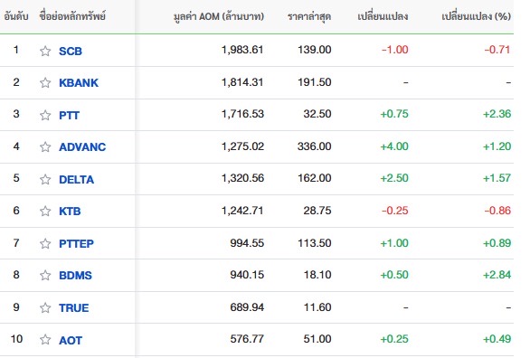 10 อันดับหลักทรัพย์ที่มีมูลค่าการซื้อขายสูงสุด