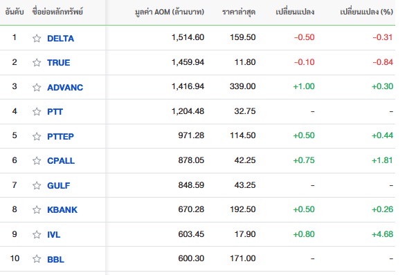 10 อันดับหลักทรัพย์ที่มีมูลค่าการซื้อขายสูงสุด