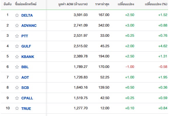 10 อันดับหลักทรัพย์ที่มีมูลค่าการซื้อขายสูงสุด